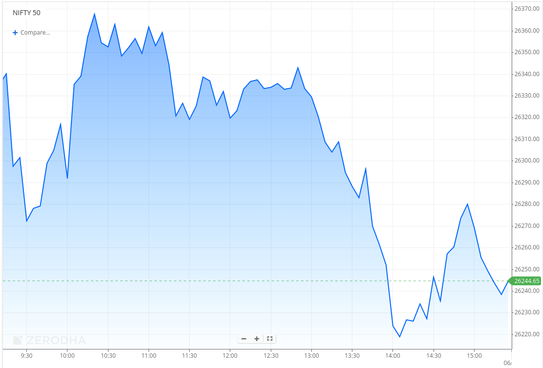 Nifty eventually closed at 26,250.30, ending near the lower end of the day’s range after a volatile session marked by profit-taking near record highs and heightened geopolitical uncertainty.