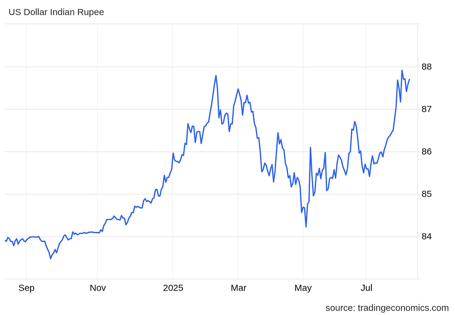 The Indian rupee weakened to 87.7 per USD after the US doubled tariffs on Indian imports to 50% over Russian oil purchases. Consumer inflation fell to a six-year low of 2.1%, leading the RBI to hold rates steady. Markets now expect another rate cut later this year. Dive deeper
