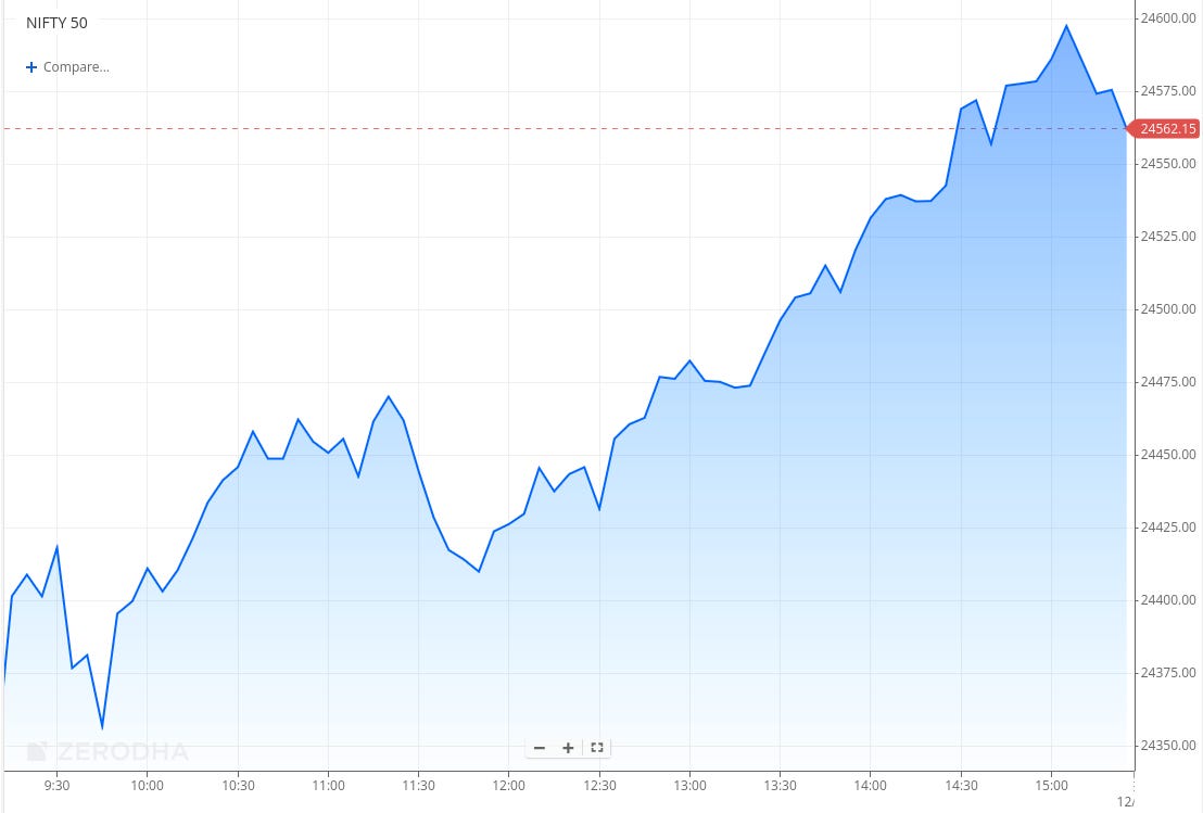 Nifty opened flat at 24,371.50 and consolidated between 24,350 and 24,400 in the first hour before inching higher to 24,475 by noon. In the second half, the index gained momentum, crossing 24,500 and 24,600 in the last hour. It eventually closed near the day’s high at 24,585.05, up 0.91%, fully reversing Friday’s decline.