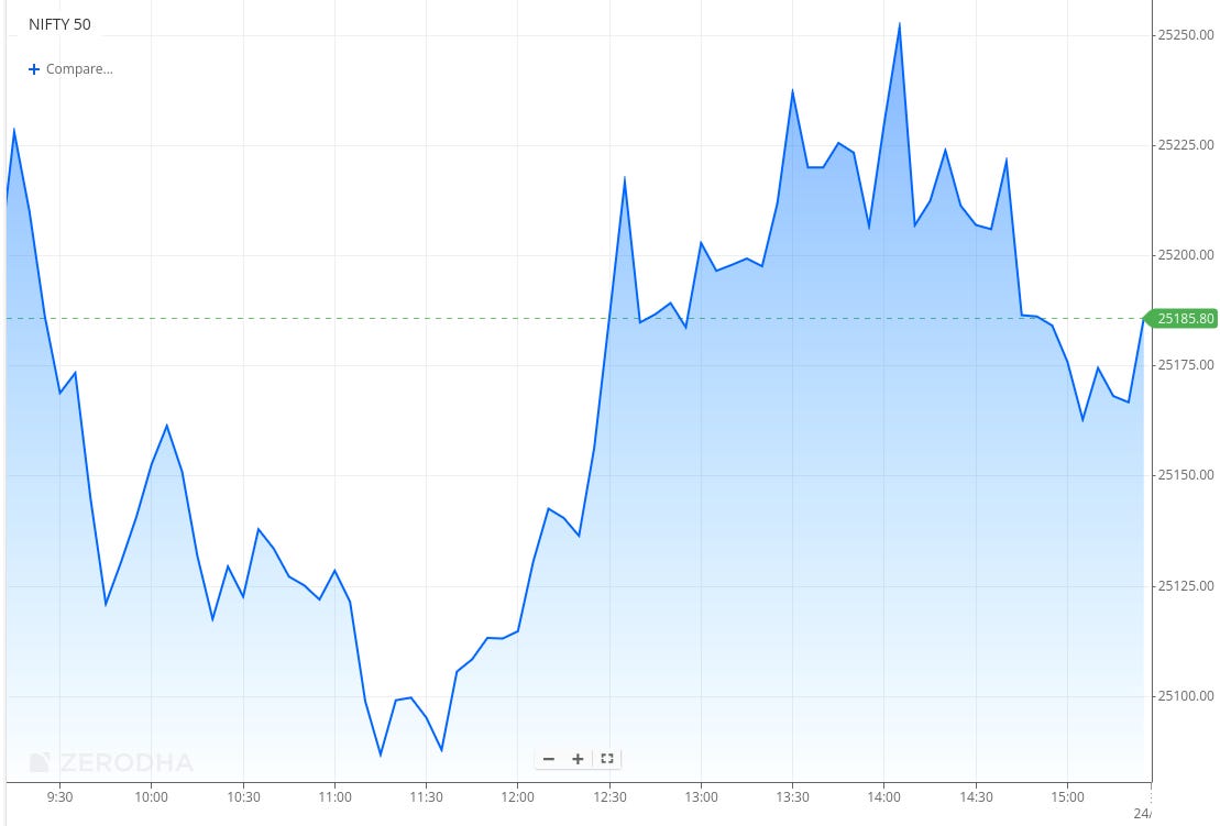 In the second half, Nifty staged a sharp rebound around mid-day, reclaiming the 25,200 mark and extending gains to touch an intraday high near 25,260. However, some volatility in the final hour capped the upside, and the index eventually turned red and closed at 25,169.50, modestly lower from the opening level but off its early lows.