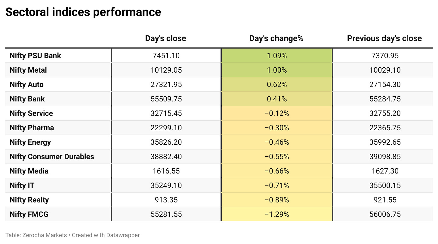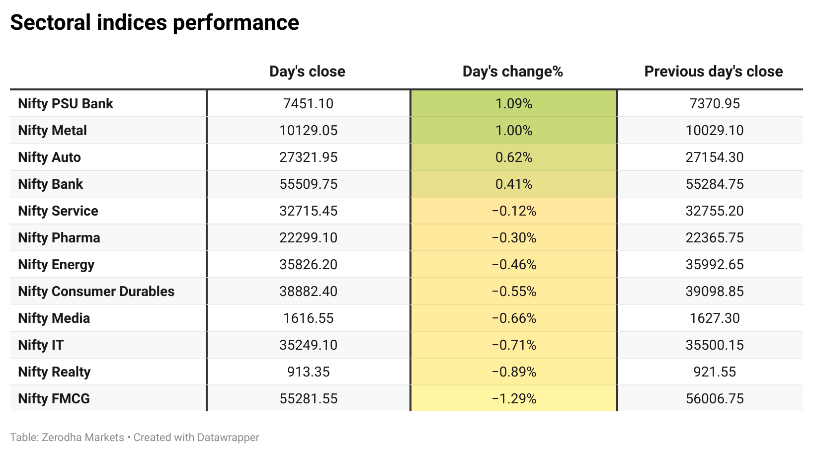 The top-gaining sector for the day was Nifty PSU Bank, which rose by 1.09%, while the top losing sector was Nifty FMCG, which fell by 1.29%. Out of the 12 sectoral indices, 4 closed in the green, and 8 ended in the red, indicating broad-based weakness across sectors.