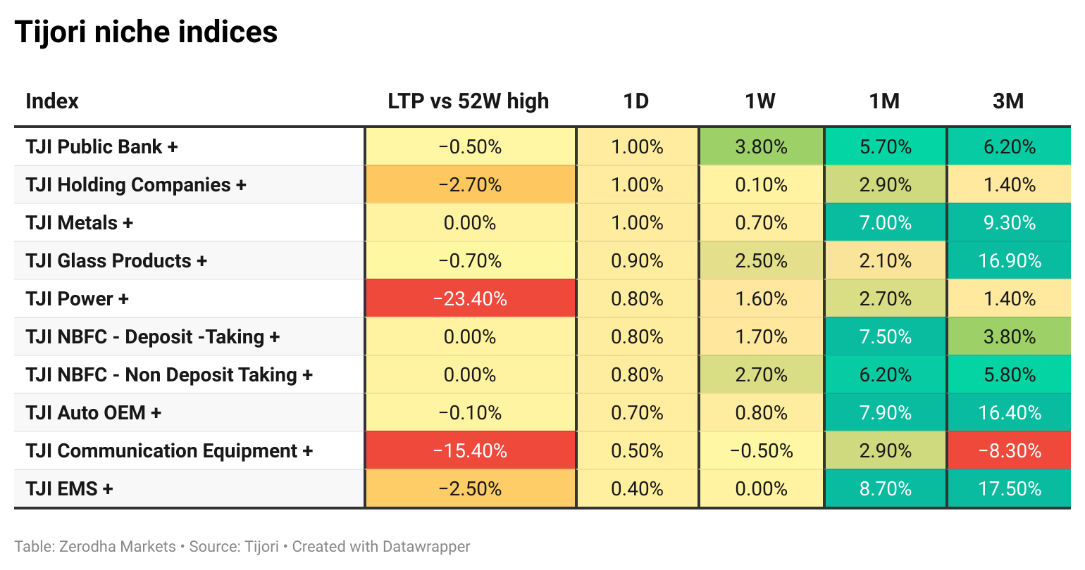Tijori is an investment research platform, and they have constructed niche indices for various themes and sub-sectors. They help you understand the market performance of narrow slices of the market. You can also track the Promoter buying and other interesting stuff like Capex activity by the companies in the Tijori App’s idea dashboard