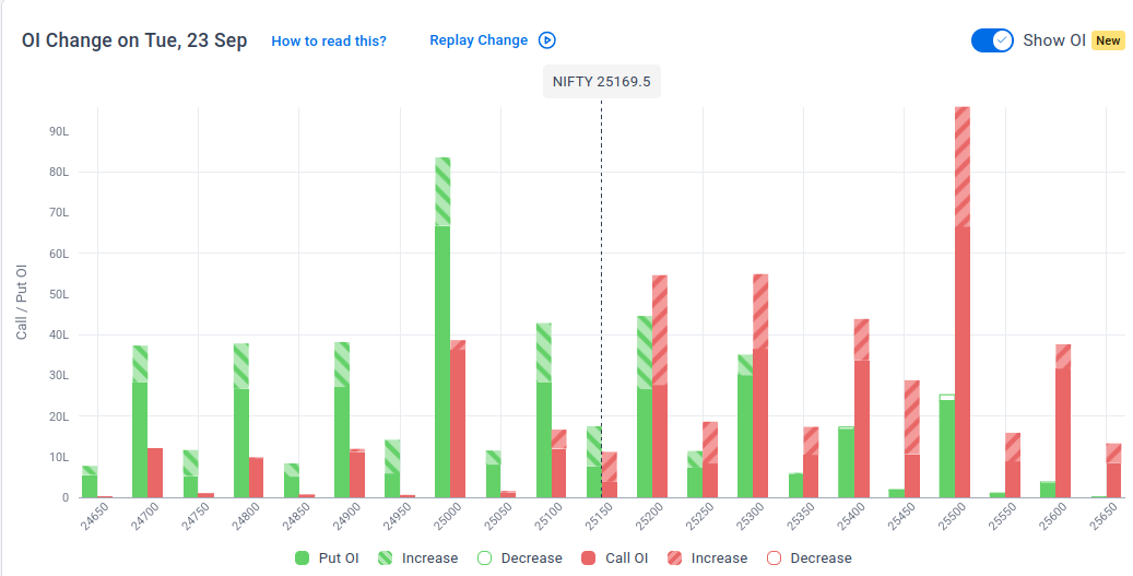 The maximum Put Open Interest (OI) is observed at 25,000, followed by 25,200, suggesting strong support at 25,100 to 25,000 levels.