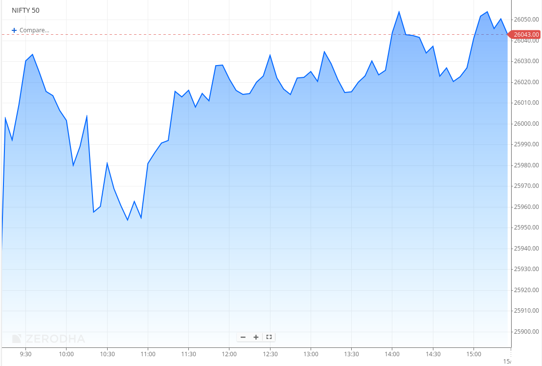 In the final hour, Nifty held firm near the highs and closed at 26,046.95, up 0.57%, marking a strong follow-through session driven by optimism around trade developments.