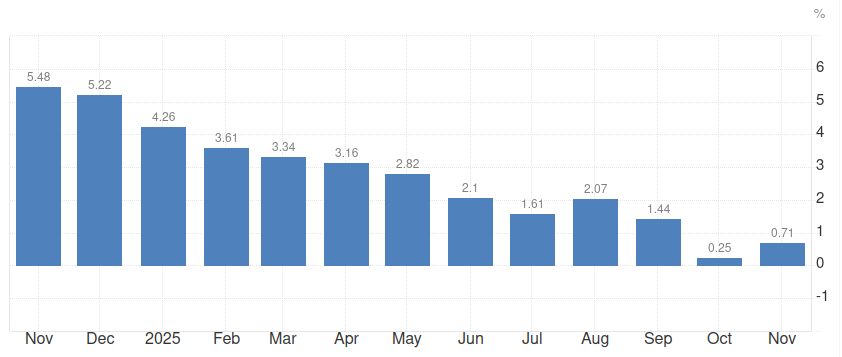 India’s CPI inflation edged up to 0.71% in November from a record low of 0.25% in October, driven by higher prices of vegetables, eggs, meat, spices, and fuel. Food inflation, however, remained in deflation at –3.91% year-on-year. Dive deeper
