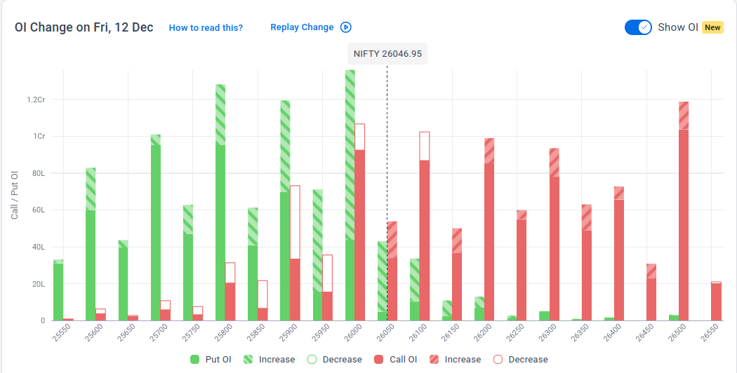 The maximum Put Open Interest (OI) is observed at 26,000, followed by 25,800 & 25,900, suggesting support at the 26,000 to 25,900 levels.