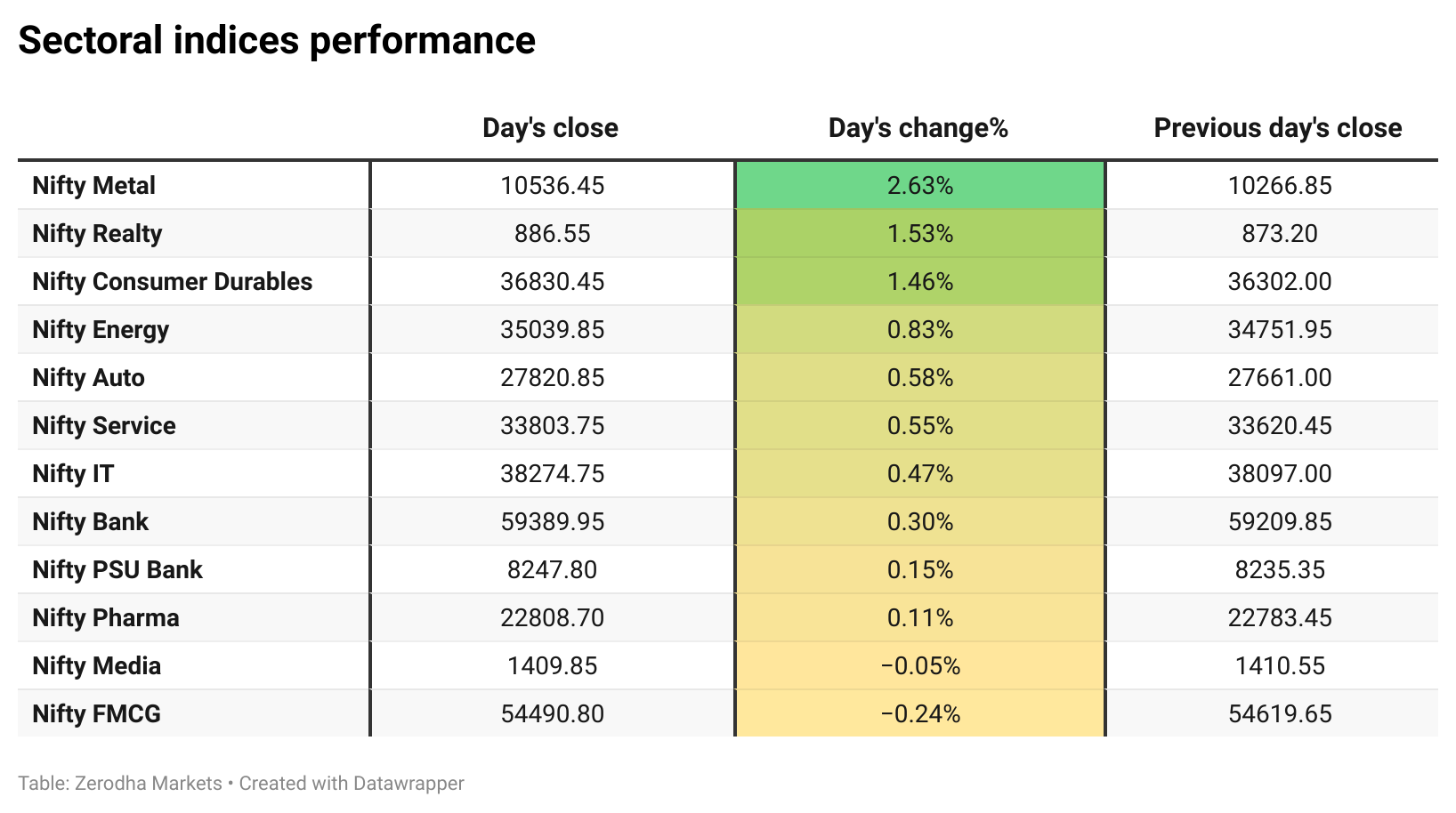 Nifty Metal was the top gainer, rising 2.63%, followed by Nifty Realty and Consumer Durables with gains of 1.53% and 1.46%, respectively. On the flip side, Nifty FMCG was the worst performer, slipping 0.24%. Out of the 12 sectoral indices, 10 ended in the green while 2 closed in the red, reflecting broad-based positive sentiment.