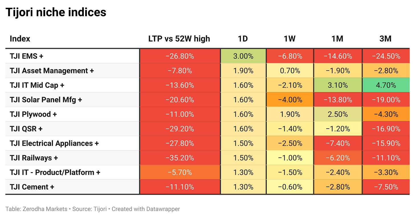 Tijori is an investment research platform, and they have constructed niche indices for various themes and sub-sectors. They help you understand the market performance of narrow slices of the market. You can also track the Promoter buying and other interesting stuff, like Capex activity by the companies in the Tijori App’s idea dashboard