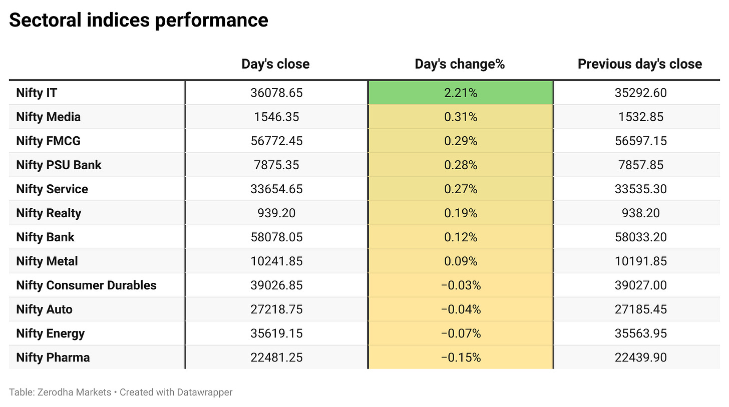 Nifty IT emerged as the top gainer, rising 2.21%, while Nifty Pharma was the biggest loser, slipping 0.15%. Out of the 12 sectoral indices, 8 closed in the green and 4 ended in the red. .