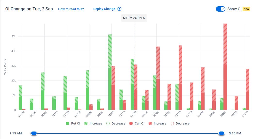 The maximum Put Open Interest (OI) is observed at 24,500, followed closely by 24,600, suggesting strong support at 24,500 to 24,400 levels.