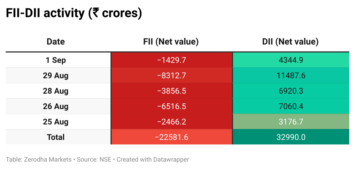 Market sentiment remains cautious. While the recent GST cut announcement has lifted hopes of a consumption boost, concerns around 50% tariffs, persistent FII outflows, and muted earnings continue to weigh on investor confidence. Focus remains on escalating U.S.-India trade tensions, which are expected to shape near-term market direction.