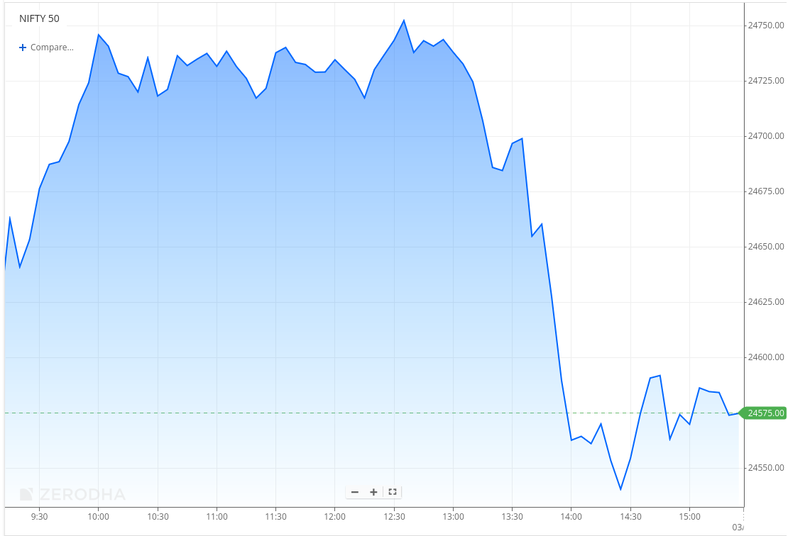 However, sentiment turned sharply negative post-lunch, with Nifty witnessing a steep decline of nearly 175 points over the next hour. The index broke below the 24,600 mark and touched an intraday low near 24,520.