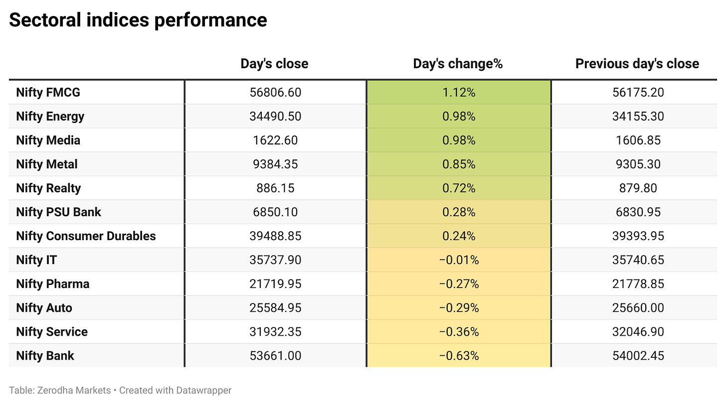 Nifty FMCG was the top gainer, rising 1.12%, while Nifty Bank was the top loser, falling 0.63%. Out of the 12 sectoral indices, 7 closed in the green and 5 ended in the red, indicating a mildly positive but selective market breadth led by gains in FMCG, energy, and metal stocks.