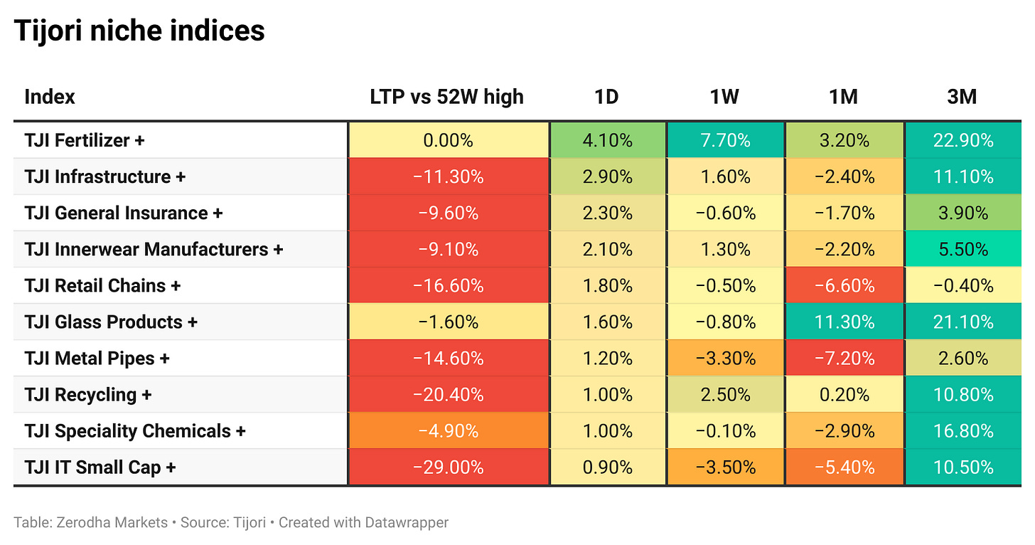 Tijori is an investment research platform, and they have constructed niche indices for various themes and sub-sectors. They help you understand the market performance of narrow slices of the market. You can also track the Promoter buying and other interesting stuff like Capex activity by the companies in the Tijori App’s idea dashboard.