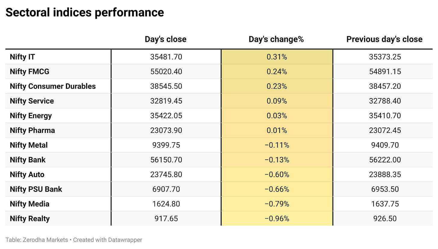 Nifty IT emerged as the top-gaining sector with a rise of 0.31%, followed by Nifty FMCG and Nifty Consumer Durables, which gained 0.24% and 0.23% respectively. On the other hand, Nifty Realty was the worst performer, slipping 0.96%, followed by Nifty Media and Nifty PSU Bank, which fell 0.79% and 0.66% respectively. Out of the 12 sectoral indices, 6 sectors ended in the green while the remaining 6 closed in the red, indicating a mixed trend across the market.