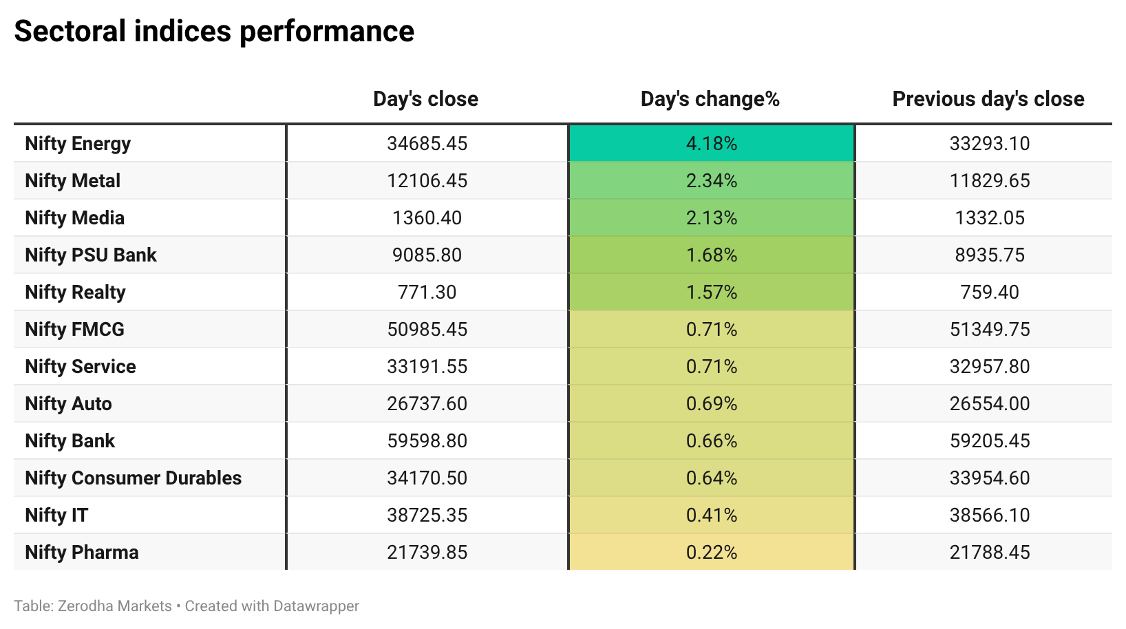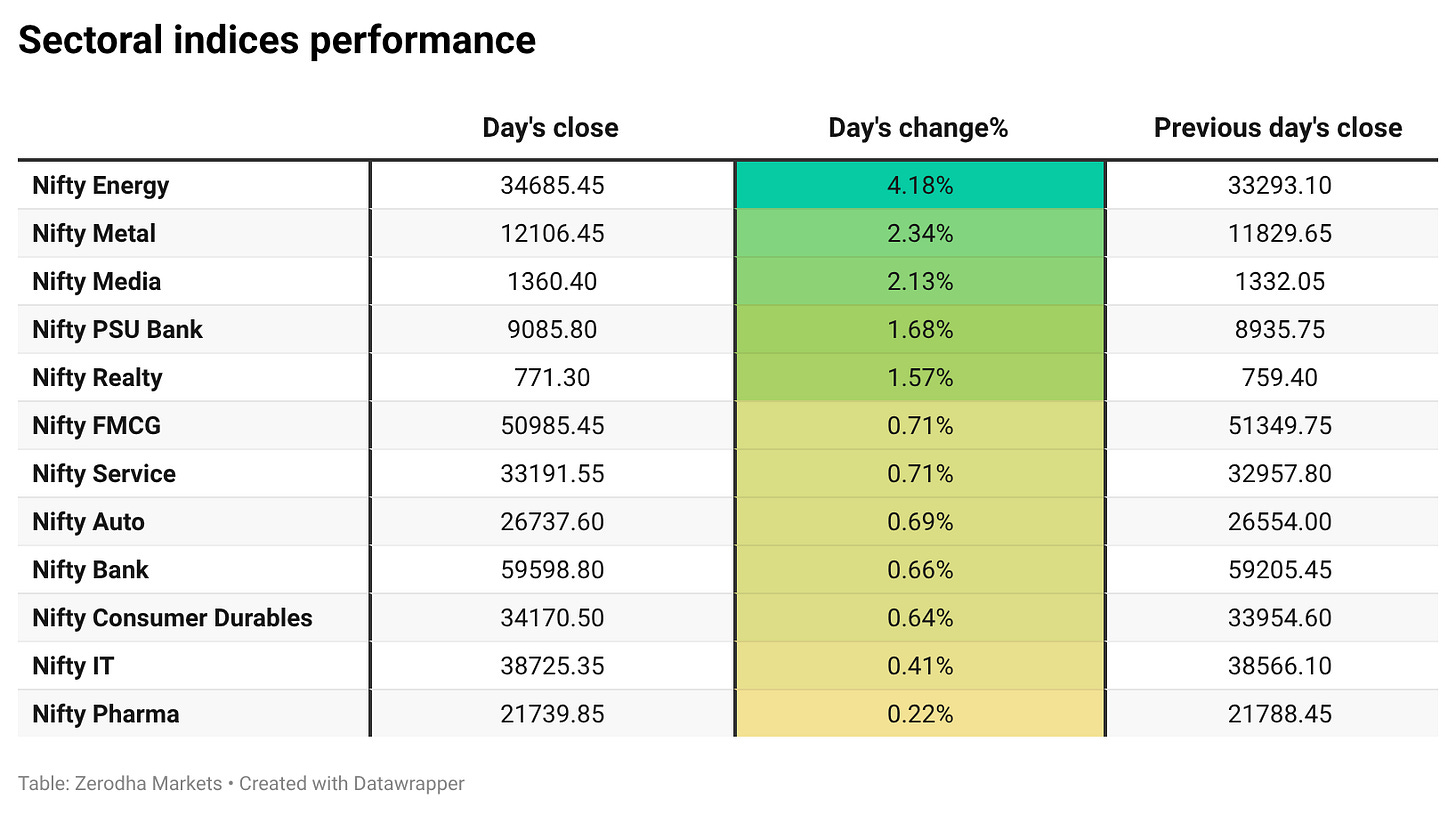 Nifty Energy led the gains with a strong 4.18% rally, followed by Metal and Media. All 12 sectors ended the day in the green, with no sector closing in the red, indicating broad-based market strength.