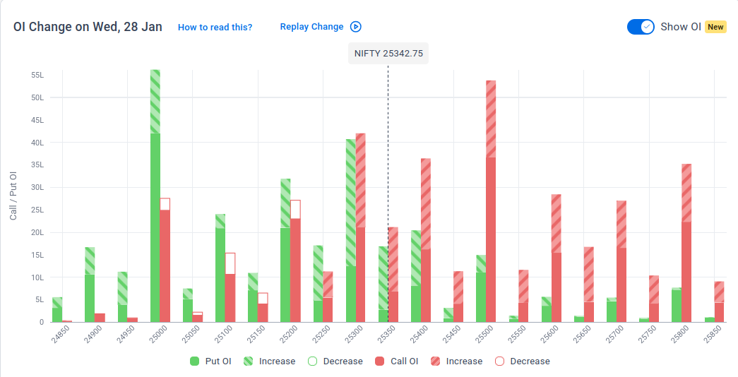The maximum Put Open Interest (OI) is observed at 25,000, followed by 25,300, suggesting support at 25,100-25,000.