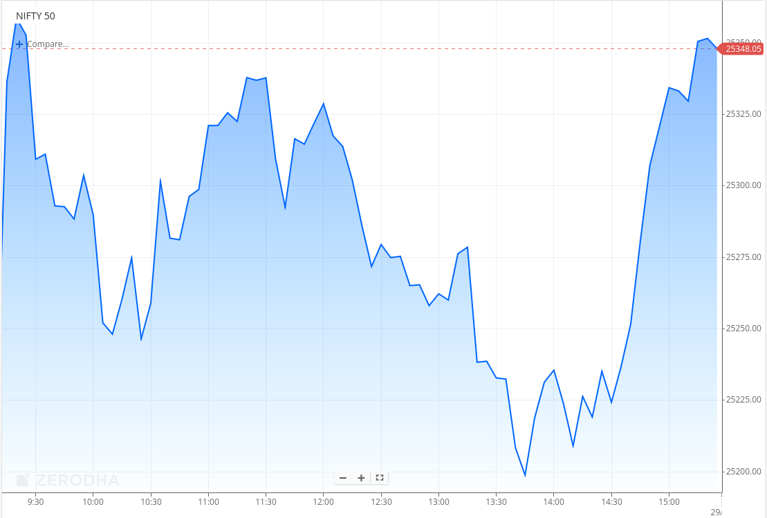 Nifty shrugs off intraday volatility to close strong near 25,350