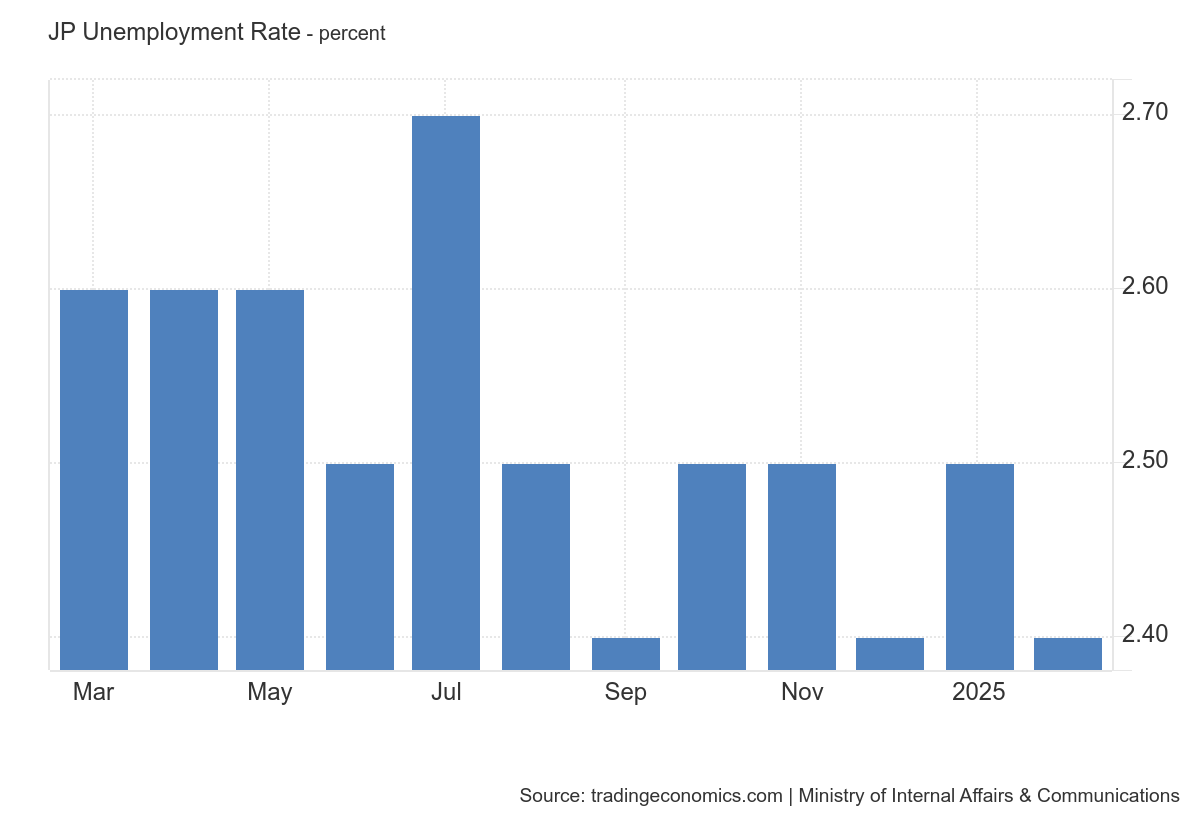 Japan's unemployment rate fell slightly to 2.4% in February 2025, defying expectations. The number of unemployed decreased by 60,000, while employment and the labor force both saw slight declines. The jobs-to-applications ratio dropped to 1.24, and the labor force participation rate stood at 63.2%. Dive deeper