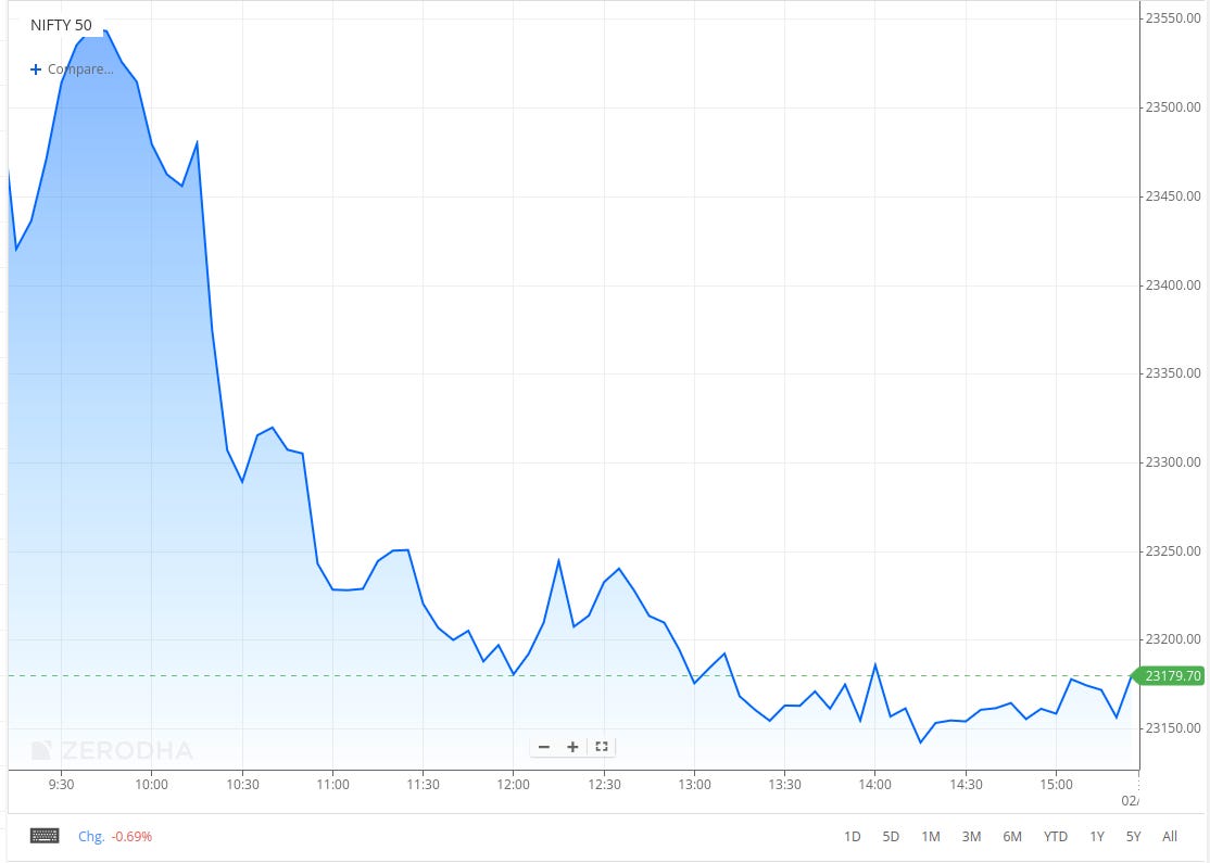 After some choppy movement, the index settled into a narrow 50-point range between 23,150 and 23,200 before finally closing at 23,165.70, down 1.5% for the day.