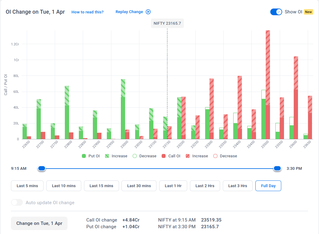 The maximum Put Open Interest (OI) is at 23,000, followed by 22,800, suggesting strong support at 23,000, with additional support at 22,900 and 22,800.