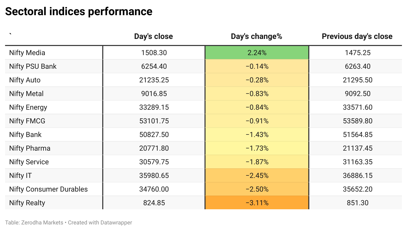 Out of the 12 sectoral indices listed, only one sector—Nifty Media—closed in the green, while the remaining 11 sectors ended in the red, reflecting broad-based weakness across the market.