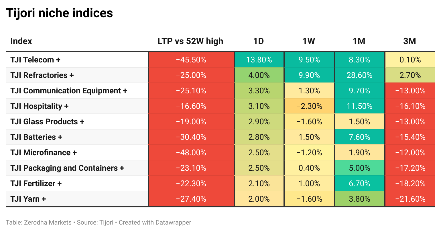 Tijori is an investment research platform, and they have constructed niche indices for various themes and sub-sectors. They help you understand the market performance of narrow slices of the market. You can also track the Promoter buying and other interesting stuff like Capex activity by the companies in the Tijori App’s idea dashboard.