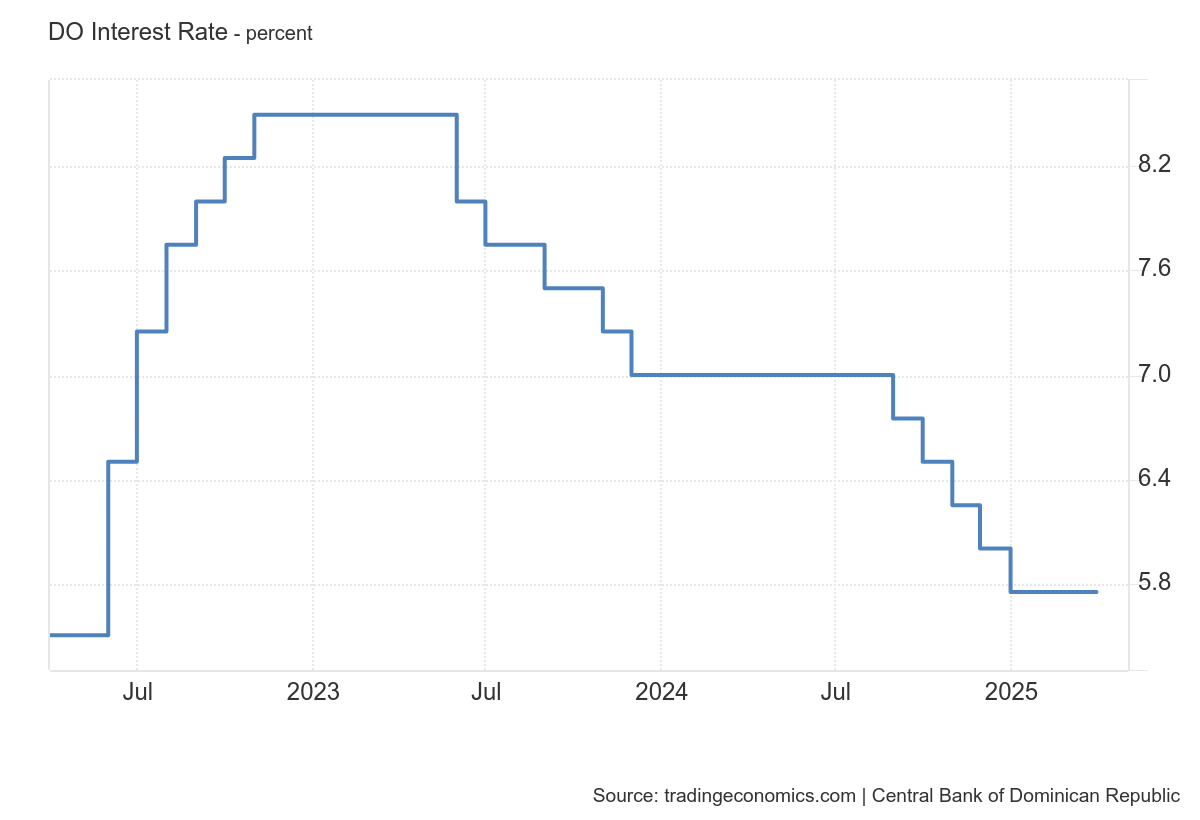 The Central Bank of the Dominican Republic maintained its interest rate at 5.75% in March 2025, after reducing it by 125 basis points since late 2024. Inflation stayed within the target range, and the economy is projected to grow by 4.5% in 2025. Private sector credit growth moderated, and international reserves reached US$14.7 billion. Dive deeper