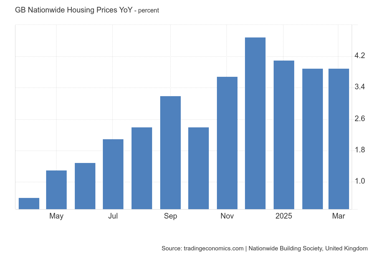 The UK's Nationwide House Price Index rose 3.9% year-on-year in March 2025, with prices stalling month-on-month. Activity may remain soft in the short term but is expected to improve as summer progresses. Northern Ireland led with 13.5% annual growth, while Scotland and Wales saw 3.9% and 3.6% increases, respectively. Dive deeper