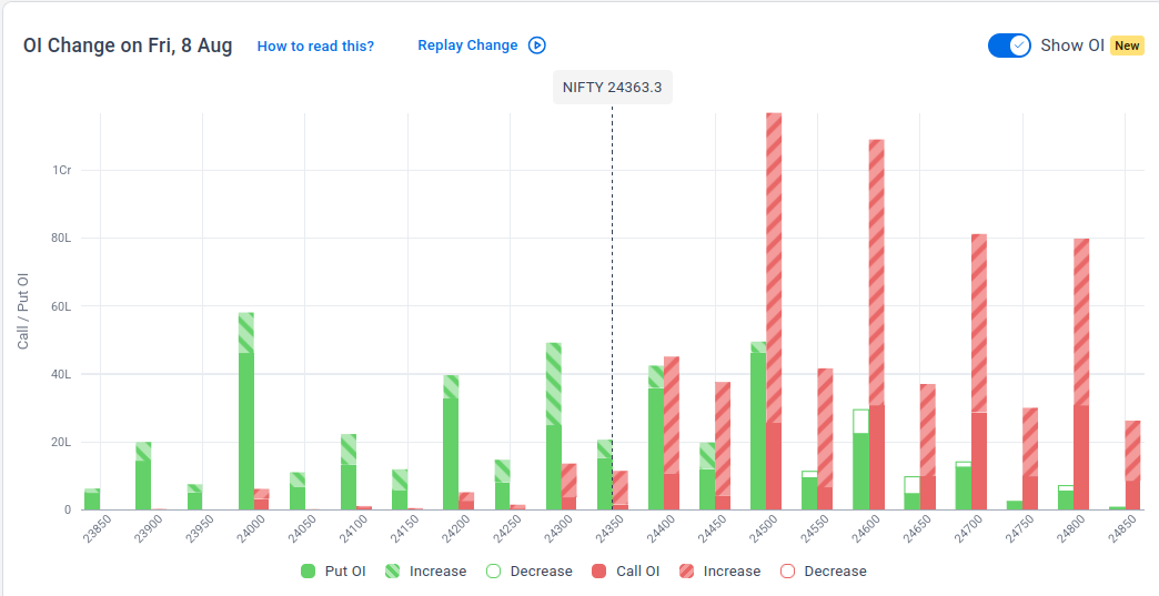 The maximum Put Open Interest (OI) is observed at 24,000, followed closely by 24,500, suggesting strong support at 24,300 to 24,200 levels.