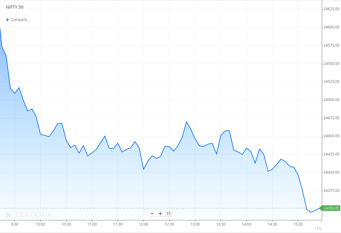 Nifty opened with a 50-point gap-down at 24,544 and quickly extended losses, testing 24,450 in the first hour. The index then consolidated between 24,420 and 24,480 for most of the day before slipping below 24,400 in the last 30 minutes and falling to 24,337. It eventually closed near the day’s low at 24,363.30, down 0.94%. This marked the sixth consecutive weekly red candle for Nifty, a rare occurrence.
