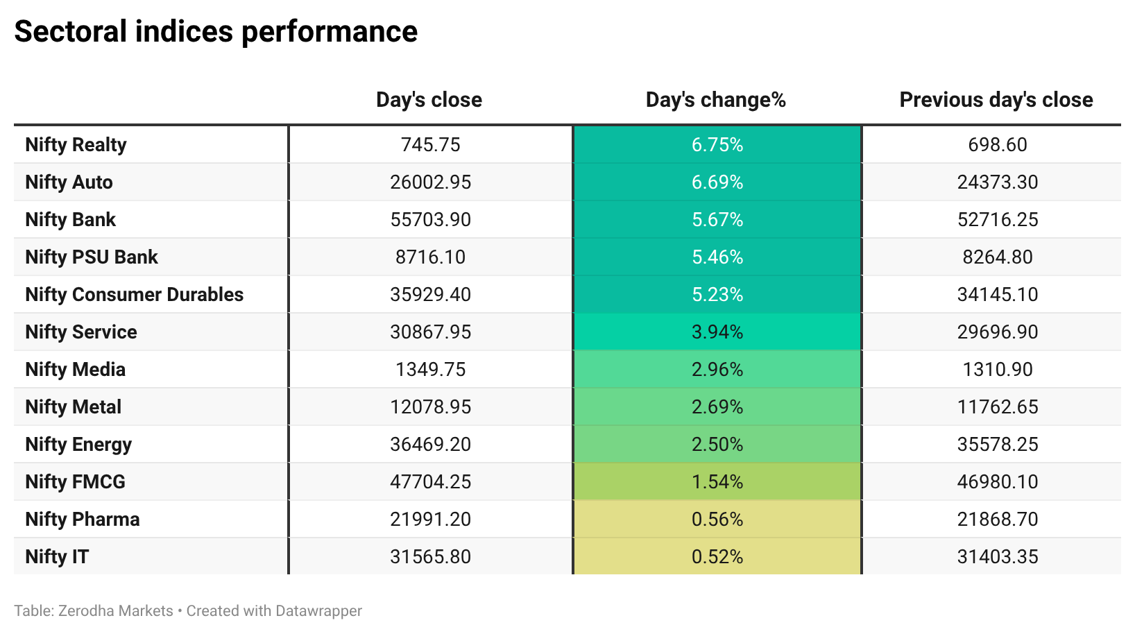 Nifty Realty was the top gainer, rising 6.75%, while Nifty IT was a relative underperformer, up just 0.52%. All 12 sectors closed in green, with 0 sectors in red.