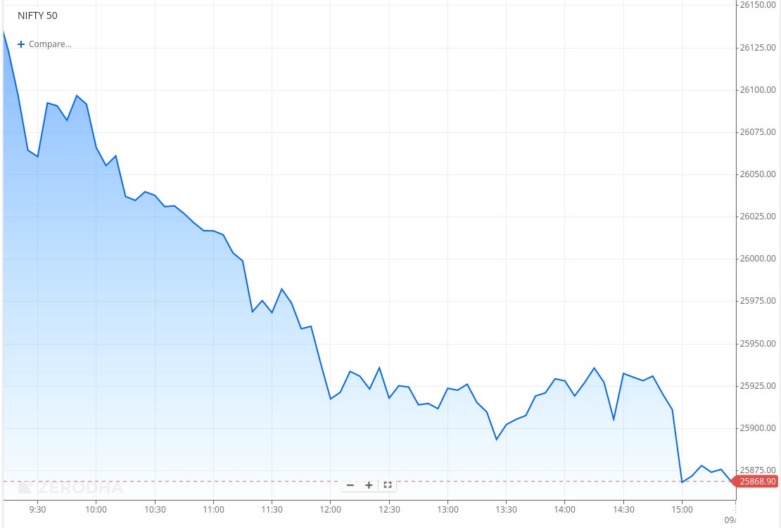 Nifty opened with a 34-point gap-down at 26,107 and came under immediate selling pressure, slipping sharply in the opening hour toward the 26,030–26,050 zone. Early rebound attempts were weak and short-lived, and the index continued to drift lower through the late morning session, slipping below the 26,000 mark after 11 AM and breaching 25,900 by noon.