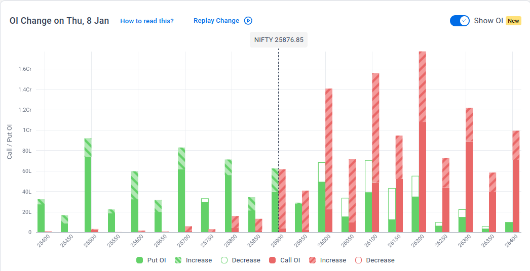 The maximum Call Open Interest (OI) is observed at 26,200, followed equally by 26,100 & 26,000, indicating potential resistance at the 26,000 -26100 levels.