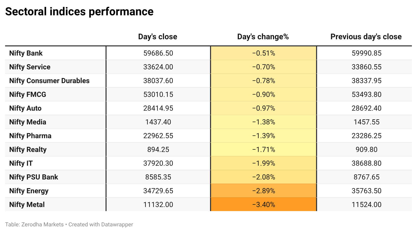The sector with minimal cuts for the day was Nifty Bank, while Nifty Metal emerged as the top losing sector with a steep decline of 3.40%. Out of the 12 sectoral indices, none closed in the green, reflecting broad-based weakness across the market.