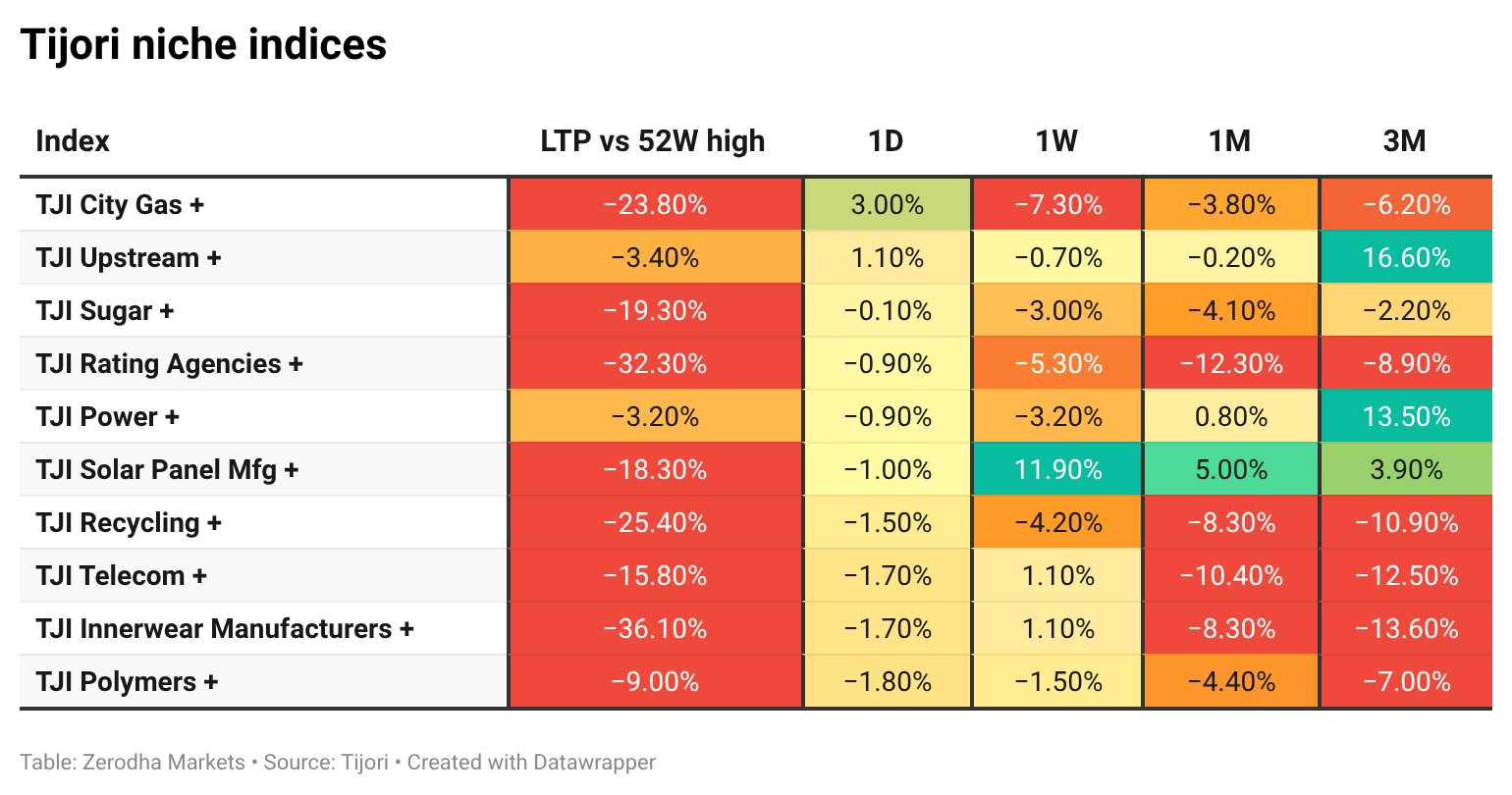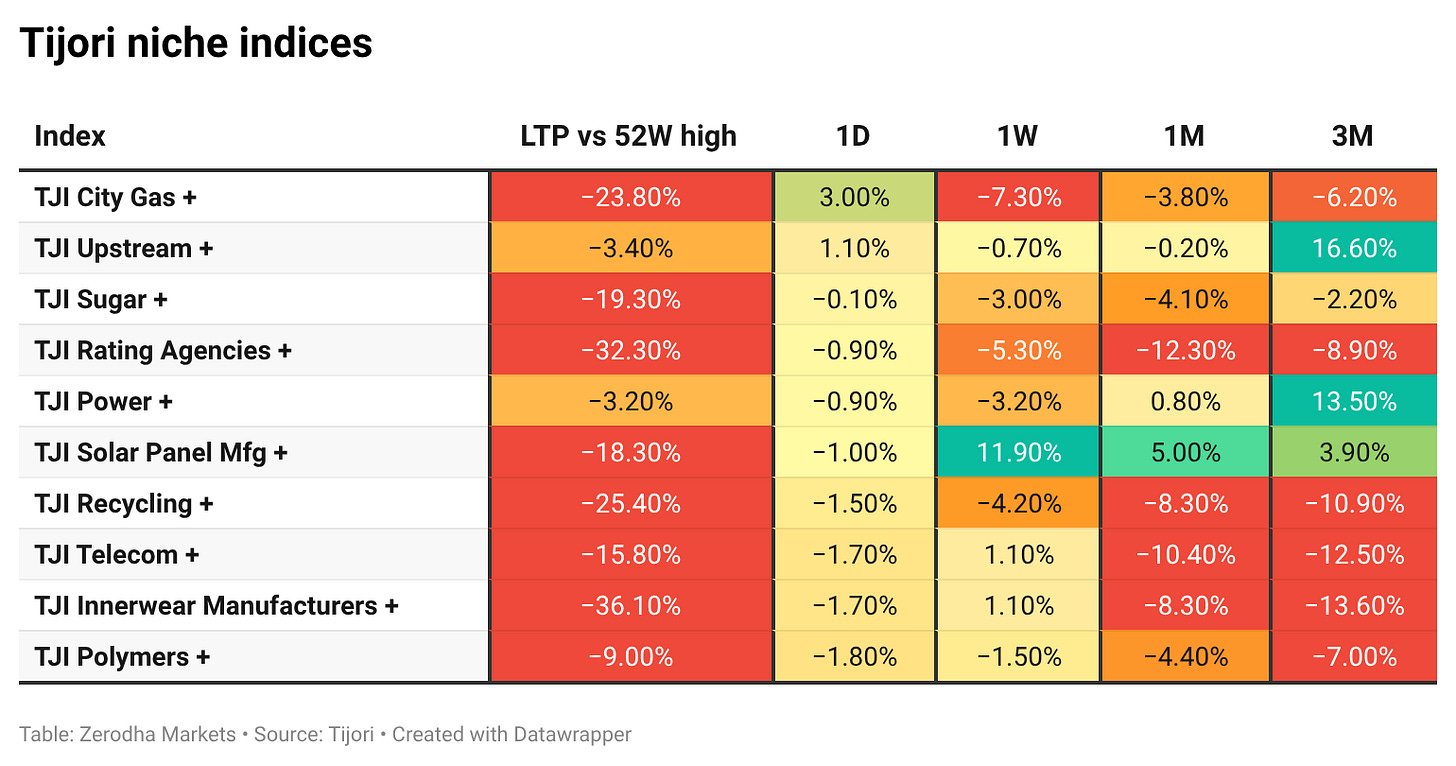 Tijori is an investment research platform that has constructed niche indices for various themes and sub-sectors. They help you understand the market performance of narrow slices of the market. You can also track the Promoter buying and other interesting stuff, like Capex activity by the companies in the Tijori App’s idea dashboard