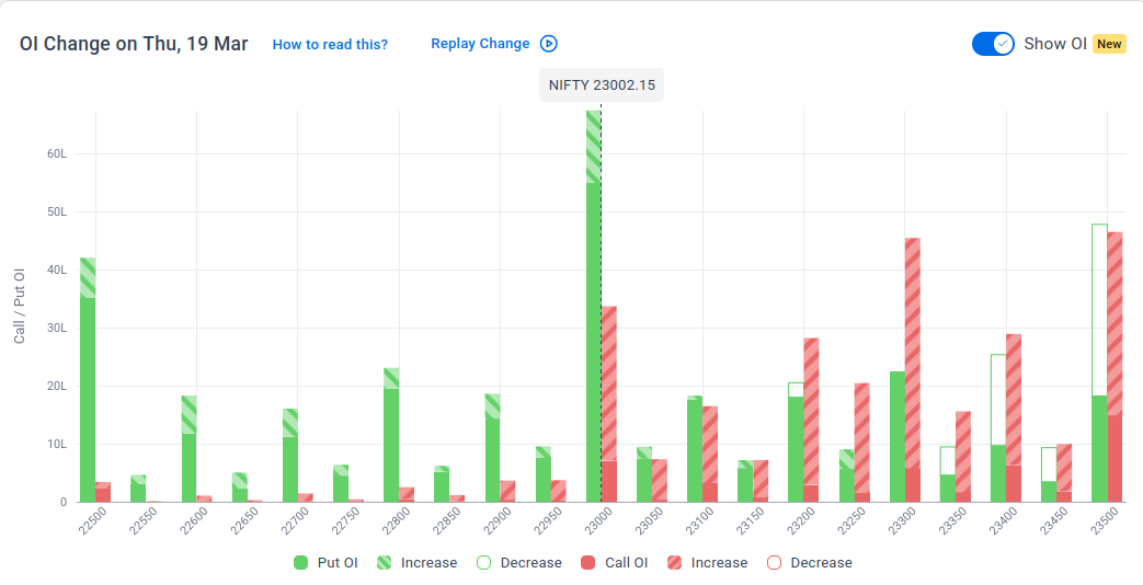 The maximum Put Open Interest (OI) is observed at 23,000, followed by 22,500, suggesting support at 22,800-22,700.