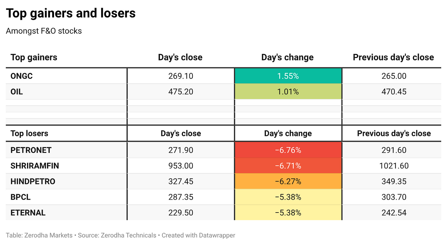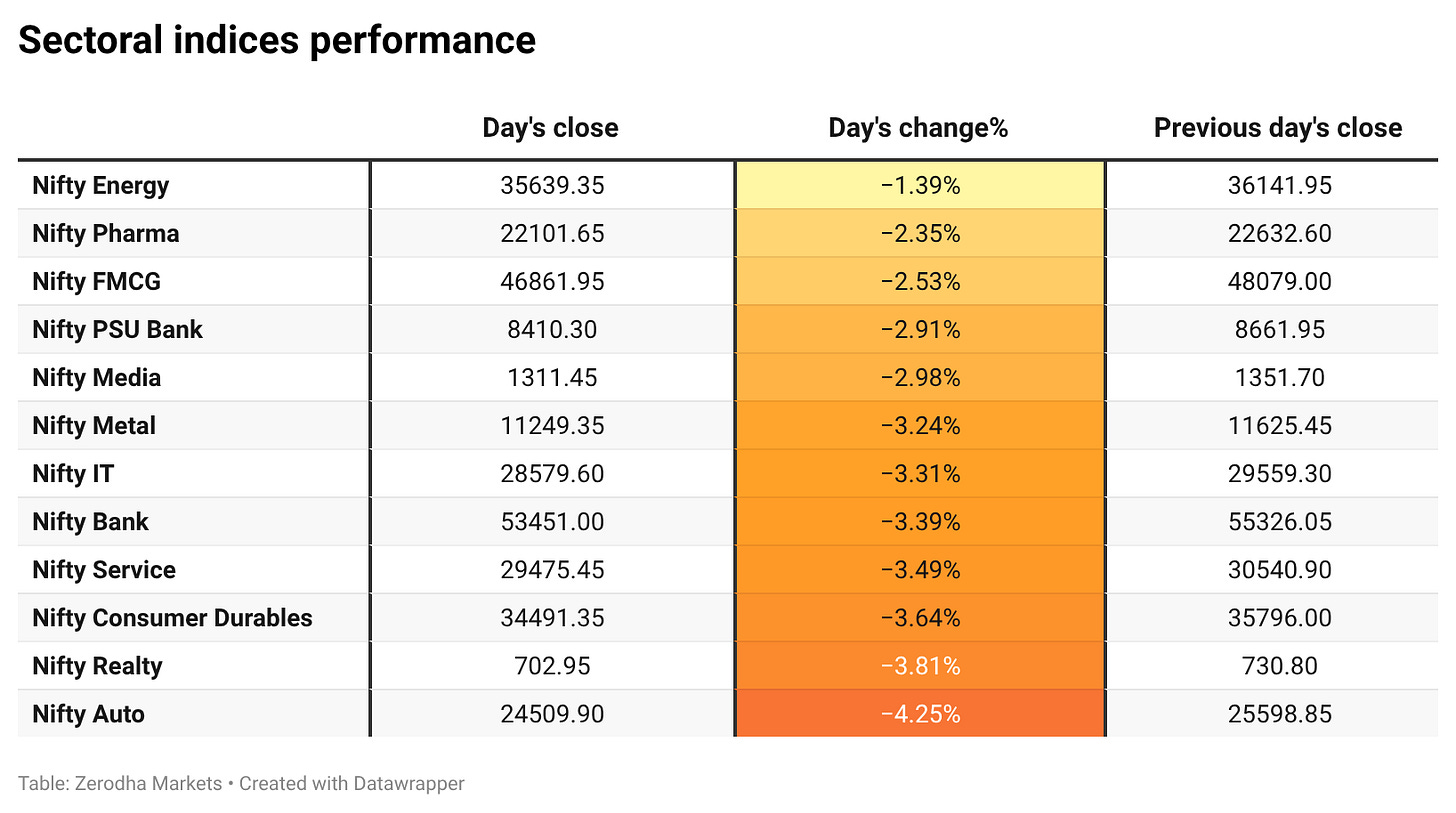 Sectoral weakness was broad-based today, with no sectors closing in the green. Nifty Energy was the least negative performer, down 1.39%, while Nifty Auto was the top loser, falling sharply by 4.25%.