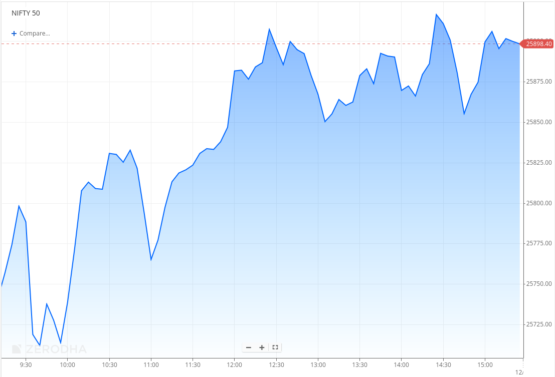 In the second half, the index extended its gains further, moving into the 25,880–25,900 zone and even testing levels close to 25,920. Although some intraday volatility pulled the index back toward 25,850, Nifty held on to most of its recovery and eventually closed at 25,898.55, up around 0.55% from the previous close. Overall, it was a constructive session, supported by a strong intraday comeback.