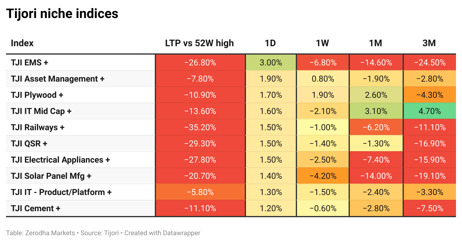 Tijori is an investment research platform, and they have constructed niche indices for various themes and sub-sectors. They help you understand the market performance of narrow slices of the market. You can also track the Promoter buying and other interesting stuff, like Capex activity by the companies in the Tijori App’s idea dashboard
