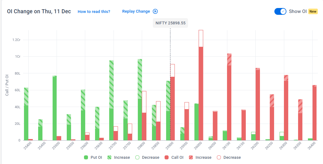 The maximum Call Open Interest (OI) is observed at 26,000, followed by 26,100, indicating potential resistance at the 26,000 -26,100 levels.