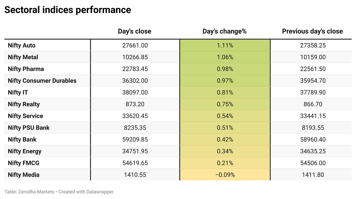 Nifty Auto emerged as the top gainer with a 1.11% rise, followed closely by Nifty Metal and Nifty Pharma. On the flip side, Nifty Media was the sole sector to close in the red, slipping by 0.09%. Out of the 12 sectoral indices, 11 ended in the green while only 1 closed in the red — signaling broad-based market strength for the day.