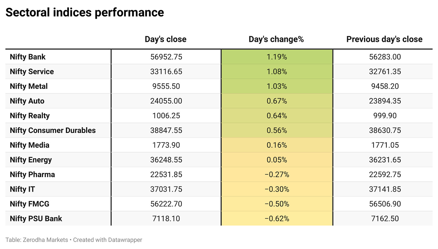 The top-gaining sector of the day was Nifty Bank, which rose by 1.19%, followed closely by Nifty Service and Nifty Metal, which gained 1.08% and 1.03% respectively. On the other hand, Nifty PSU Bank was the worst performer, declining by 0.62%, with Nifty FMCG and Nifty IT also ending in the red, down 0.50% and 0.30% respectively.