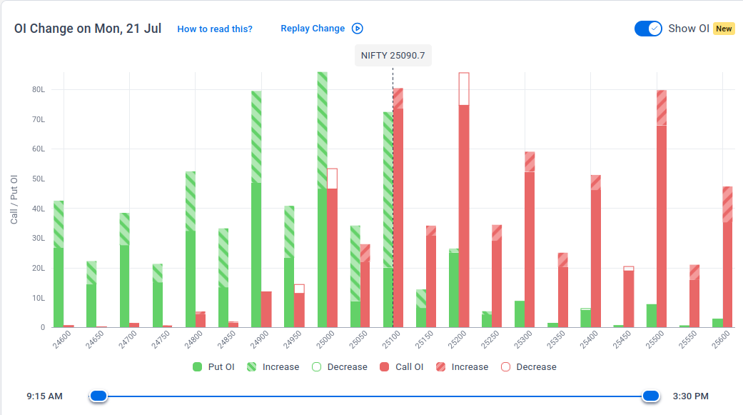 The maximum Put Open Interest (OI) is observed at 25,000, followed closely by 24,900, suggesting strong support at 24,900 to 24,800 levels.