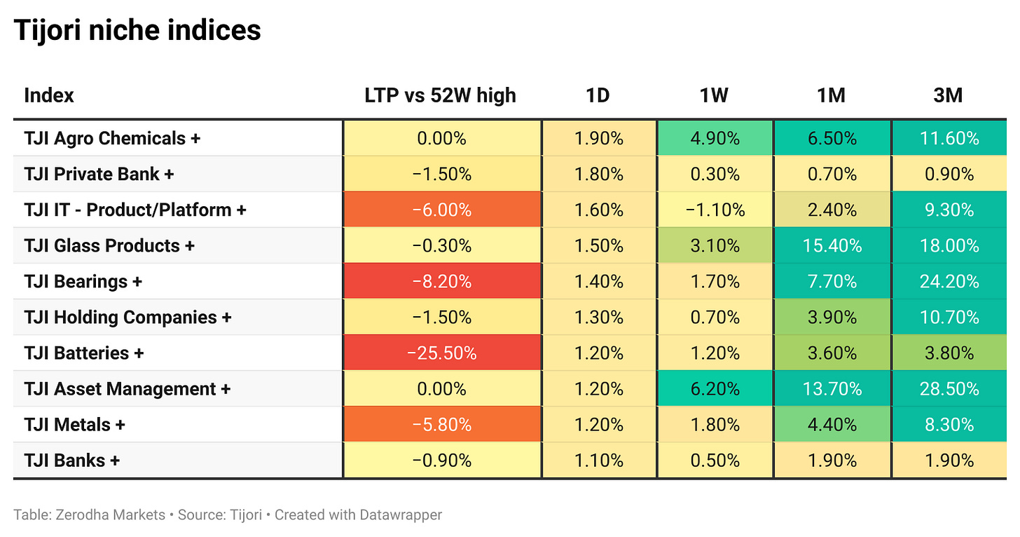 Tijori is an investment research platform, and they have constructed niche indices for various themes and sub-sectors. They help you understand the market performance of narrow slices of the market. You can also track the Promoter buying and other interesting stuff like Capex activity by the companies in the Tijori App’s idea dashboard.