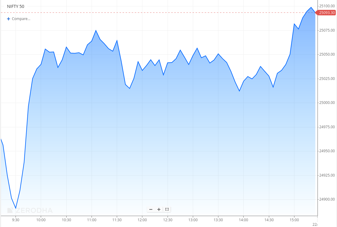 Nifty 50 opened with a 30-point gap-up at 24,999 but slipped by 120 points to hit a low of 24,882.30 in the first hour. This was followed by a sharp 170-point rebound that saw the index test 25,050—also within the first hour. For most of the day, Nifty remained rangebound between 25,000 and 25,050 before witnessing a late surge in the final hour, briefly touching 25,100 and eventually closing at 25,090.70, up by 0.48%.