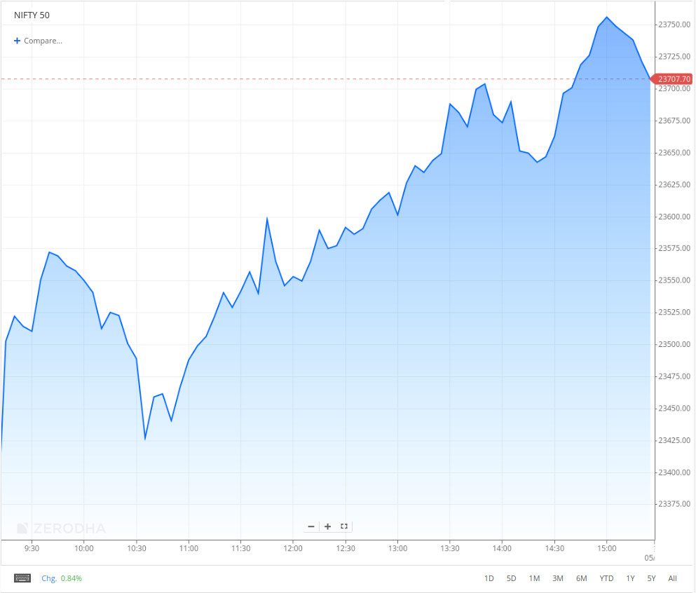 Tracking overnight global cues and with the US markets recovering most of their losses, Nifty opened higher by nearly 150 points at 23,509.90. It traded in a narrow range between 23,500 and 23,560 during the first hour, before dipping to a low of 23,423.15. After holding that level for 15 minutes, the index rebounded sharply, triggering a broad-based rally.