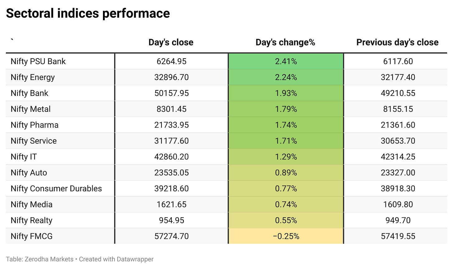 The sectoral indices saw a strong performance, with 11 out of 12 sectors closing in the green. Nifty PSU Bank led the gains with a 2.41% rise to 6264.95, followed by Nifty Energy, which increased by 2.24% to 32,896.70. Nifty Bank also showed strength, climbing 1.93% to 50,157.95. On the other hand, Nifty FMCG was the only sector to close in the red, slipping 0.25% to 57,274.70. Overall, the banking and energy sectors led the market's upward momentum, while FMCG remained under slight pressure.