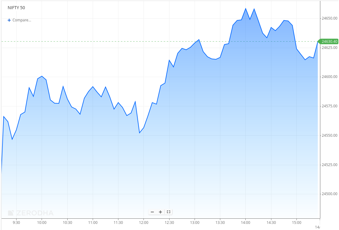 Nifty opened with a 100-point gap-up at 24,586 on the back of strong global cues and traded in a narrow range between 24,550 and 24,600 during the first half. In the second half, the index moved its base higher, consolidating between 24,600 and 24,650, and eventually closed at 24,619.35, up 0.54%.