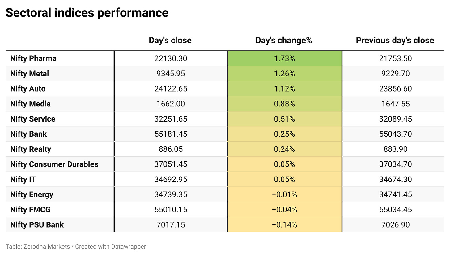 Nifty Pharma was the top gainer, surging 1.73%, followed by Nifty Metal and Nifty Auto, which gained 1.26% and 1.12% respectively. On the losing side, Nifty PSU Bank was the weakest performer, slipping 0.14%, trailed by Nifty FMCG and Nifty Energy, which dipped 0.04% and 0.01% respectively. Out of the 12 sectoral indices, 9 ended in the green while 3 closed in the red, indicating a broadly positive sentiment across the market.